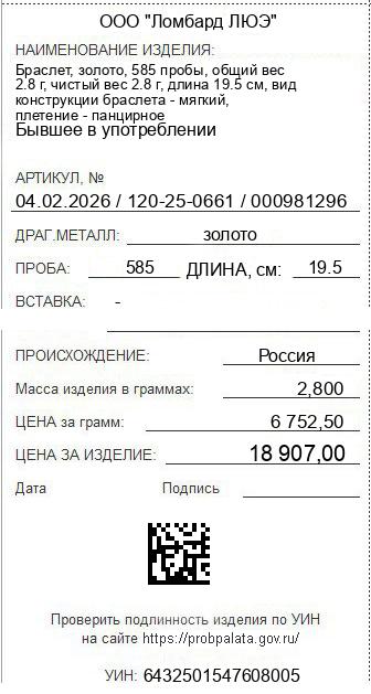 Цена за грамм общего веса: 6752.5Цена за грамм чистого веса: 6752.5Организация: ООО "Ломбард ЛЮЭ"Металл: золотоПроба: 585Артикул: 04.02.2026 / 120-25-0661 / 000981296Базовая единица: шт