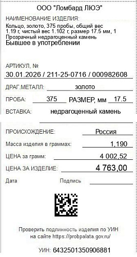 Цена за грамм общего веса: 4002.52Цена за грамм чистого веса: 4322.14Организация: ООО "Ломбард ЛЮЭ"Металл: золотоПроба: 375Артикул: 30.01.2026 / 211-25-0716 / 000982608Базовая единица: шт