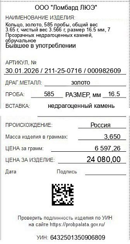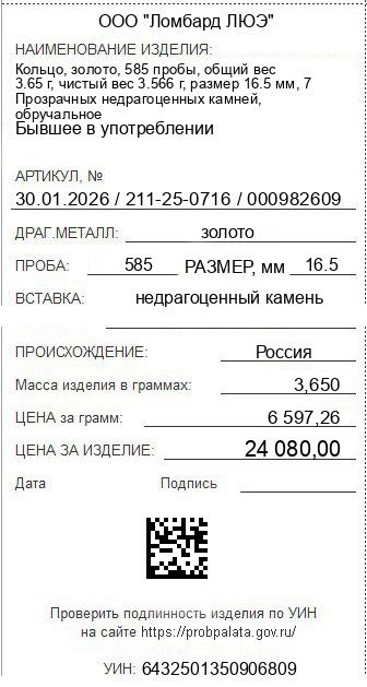 Цена за грамм общего веса: 6597.26Цена за грамм чистого веса: 6752.66Организация: ООО "Ломбард ЛЮЭ"Металл: золотоПроба: 585Артикул: 30.01.2026 / 211-25-0716 / 000982609Базовая единица: шт