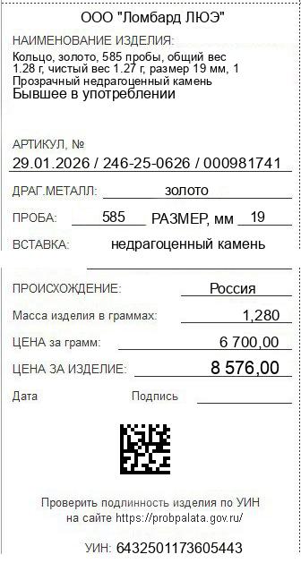 Цена за грамм общего веса: 6700Цена за грамм чистого веса: 6752.76Организация: ООО "Ломбард ЛЮЭ"Металл: золотоПроба: 585Артикул: 29.01.2026 / 246-25-0626 / 000981741Базовая единица: шт