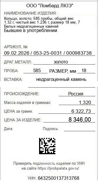 Цена за грамм общего веса: 6322.73Цена за грамм чистого веса: 6752.43Организация: ООО "Ломбард ЛЮЭ"Металл: золотоПроба: 585Артикул: 09.02.2026 / 053-25-0031 / 000983738Базовая единица: шт