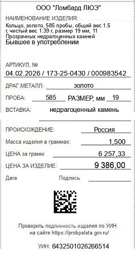 Цена за грамм общего веса: 6257.33Цена за грамм чистого веса: 6752.52Организация: ООО "Ломбард ЛЮЭ"Металл: золотоПроба: 585Артикул: 04.02.2026 / 173-25-0430 / 000983542Базовая единица: шт