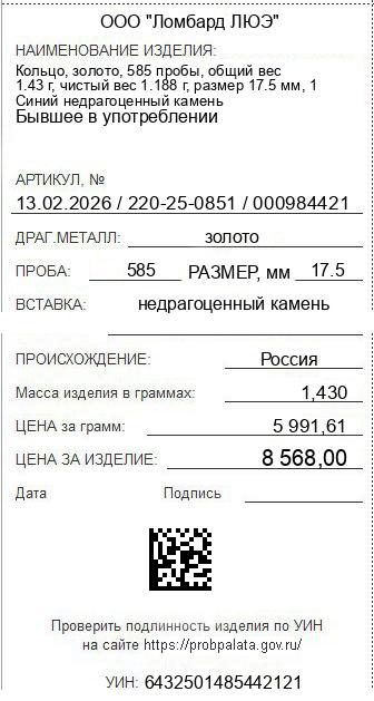 Цена за грамм общего веса: 5991.61Цена за грамм чистого веса: 7212.12Организация: ООО "Ломбард ЛЮЭ"Металл: золотоПроба: 585Артикул: 13.02.2026 / 220-25-0851 / 000984421Базовая единица: шт
