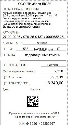 Цена за грамм общего веса: 6953.19Цена за грамм чистого веса: 7994.13Организация: ООО "Ломбард ЛЮЭ"Металл: золотоПроба: 585Артикул: 27.02.2026 / 070-25-0437 / 000985525Базовая единица: шт