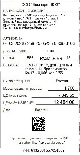 Цена за грамм общего веса: 7343.53Цена за грамм чистого веса: 8544.83Организация: ООО "Ломбард ЛЮЭ"Металл: золотоПроба: 585Артикул: 03.03.2026 / 259-25-0543 / 000986103Базовая единица: шт