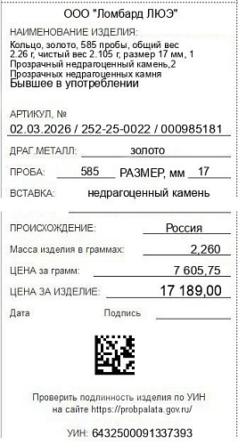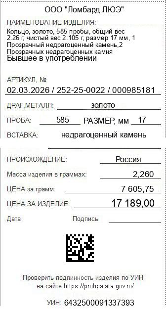 Цена за грамм общего веса: 7605.75Цена за грамм чистого веса: 8165.8Организация: ООО "Ломбард ЛЮЭ"Металл: золотоПроба: 585Артикул: 02.03.2026 / 252-25-0022 / 000985181Базовая единица: шт