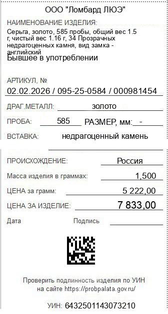 Цена за грамм общего веса: 5222Цена за грамм чистого веса: 6752.59Организация: ООО "Ломбард ЛЮЭ"Металл: золотоПроба: 585Артикул: 02.02.2026 / 095-25-0584 / 000981454Базовая единица: шт