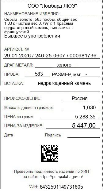 Цена за грамм общего веса: 5288.35Цена за грамм чистого веса: 6834.38Организация: ООО "Ломбард ЛЮЭ"Металл: золотоПроба: 583Артикул: 29.01.2026 / 246-25-0607 / 000981736Базовая единица: шт