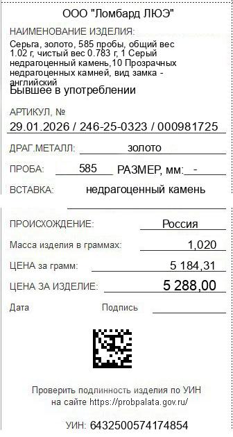 Цена за грамм общего веса: 5184.31Цена за грамм чистого веса: 6753.51Организация: ООО "Ломбард ЛЮЭ"Металл: золотоПроба: 585Артикул: 29.01.2026 / 246-25-0323 / 000981725Базовая единица: шт