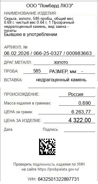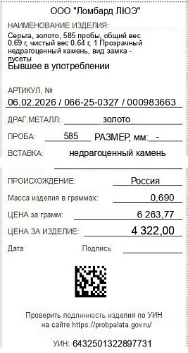 Цена за грамм общего веса: 6263.77Цена за грамм чистого веса: 6753.13Организация: ООО "Ломбард ЛЮЭ"Металл: золотоПроба: 585Артикул: 06.02.2026 / 066-25-0327 / 000983663Базовая единица: шт