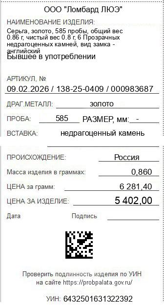 Цена за грамм общего веса: 6281.4Цена за грамм чистого веса: 6752.5Организация: ООО "Ломбард ЛЮЭ"Металл: золотоПроба: 585Артикул: 09.02.2026 / 138-25-0409 / 000983687Базовая единица: шт