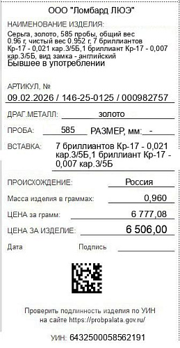 Цена за грамм общего веса: 6777.08Цена за грамм чистого веса: 6834.03Организация: ООО "Ломбард ЛЮЭ"Металл: золотоПроба: 585Артикул: 09.02.2026 / 146-25-0125 / 000982757Базовая единица: шт