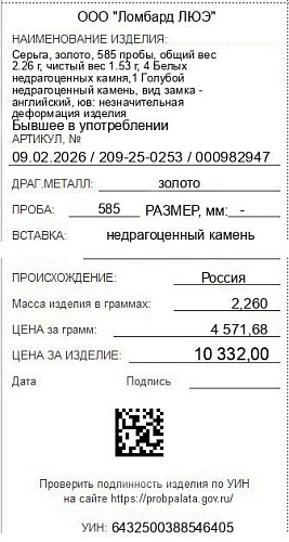 Цена за грамм общего веса: 4571.68Цена за грамм чистого веса: 6752.94Организация: ООО "Ломбард ЛЮЭ"Металл: золотоПроба: 585Артикул: 09.02.2026 / 209-25-0253 / 000982947Базовая единица: шт