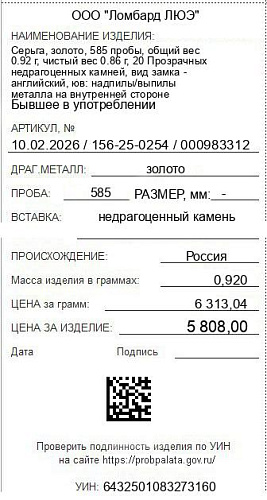 Цена за грамм общего веса: 6313.04Цена за грамм чистого веса: 6753.49Организация: ООО "Ломбард ЛЮЭ"Металл: золотоПроба: 585Артикул: 10.02.2026 / 156-25-0254 / 000983312Базовая единица: шт