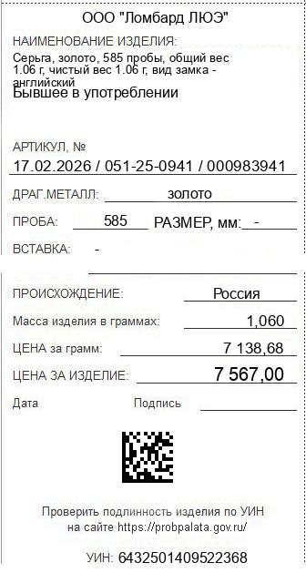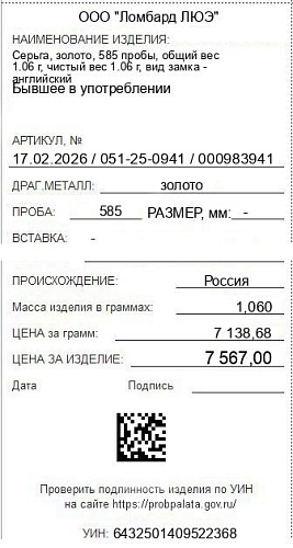 Цена за грамм общего веса: 7138.68Цена за грамм чистого веса: 7138.68Организация: ООО "Ломбард ЛЮЭ"Металл: золотоПроба: 585Артикул: 17.02.2026 / 051-25-0941 / 000983941Базовая единица: шт