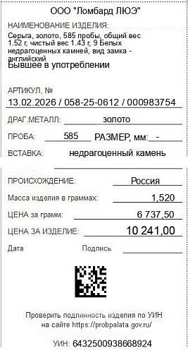 Цена за грамм общего веса: 6737.5Цена за грамм чистого веса: 7161.54Организация: ООО "Ломбард ЛЮЭ"Металл: золотоПроба: 585Артикул: 13.02.2026 / 058-25-0612 / 000983754Базовая единица: шт
