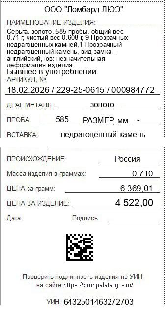 Цена за грамм общего веса: 6369.01Цена за грамм чистого веса: 7437.5Организация: ООО "Ломбард ЛЮЭ"Металл: золотоПроба: 585Артикул: 18.02.2026 / 229-25-0615 / 000984772Базовая единица: шт