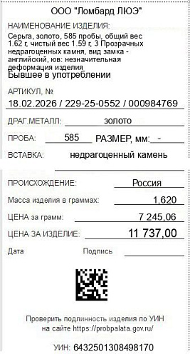 Цена за грамм общего веса: 7245.06Цена за грамм чистого веса: 7381.76Организация: ООО "Ломбард ЛЮЭ"Металл: золотоПроба: 585Артикул: 18.02.2026 / 229-25-0552 / 000984769Базовая единица: шт