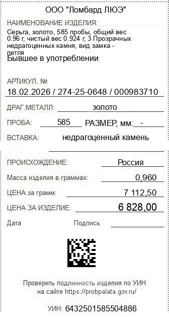 Цена за грамм общего веса: 7112.5Цена за грамм чистого веса: 7389.61Организация: ООО "Ломбард ЛЮЭ"Металл: золотоПроба: 585Артикул: 18.02.2026 / 274-25-0648 / 000983710Базовая единица: шт
