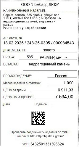 Цена за грамм общего веса: 6911.93Цена за грамм чистого веса: 7400.79Организация: ООО "Ломбард ЛЮЭ"Металл: золотоПроба: 585Артикул: 18.02.2026 / 248-25-0305 / 000984543Базовая единица: шт