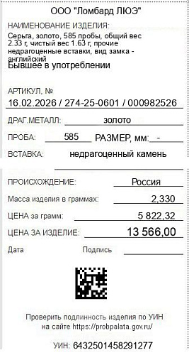 Цена за грамм общего веса: 5822.32Цена за грамм чистого веса: 8322.7Организация: ООО "Ломбард ЛЮЭ"Металл: золотоПроба: 585Артикул: 16.02.2026 / 274-25-0601 / 000982526Базовая единица: шт