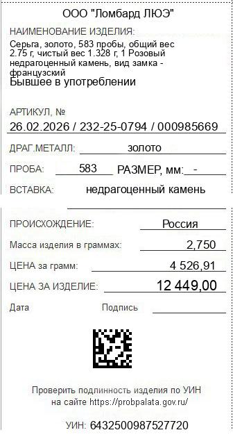 Цена за грамм общего веса: 4526.91Цена за грамм чистого веса: 9374.25Организация: ООО "Ломбард ЛЮЭ"Металл: золотоПроба: 583Артикул: 26.02.2026 / 232-25-0794 / 000985669Базовая единица: шт