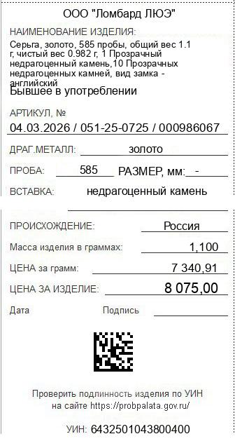 Цена за грамм общего веса: 7340.91Цена за грамм чистого веса: 8223.01Организация: ООО "Ломбард ЛЮЭ"Металл: золотоПроба: 585Артикул: 04.03.2026 / 051-25-0725 / 000986067Базовая единица: шт