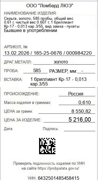 Цена за грамм общего веса: 8550.82Цена за грамм чистого веса: 8593.08Организация: ООО "Ломбард ЛЮЭ"Металл: золотоПроба: 585Артикул: 13.02.2026 / 185-25-0676 / 000984220Базовая единица: шт