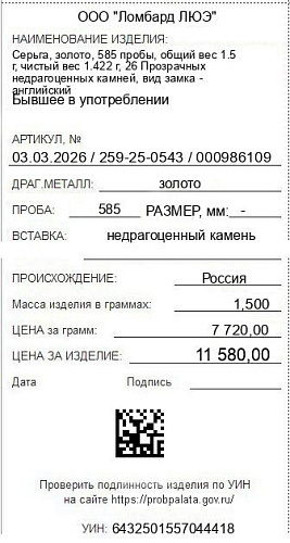 Цена за грамм общего веса: 7720Цена за грамм чистого веса: 8143.46Организация: ООО "Ломбард ЛЮЭ"Металл: золотоПроба: 585Артикул: 03.03.2026 / 259-25-0543 / 000986109Базовая единица: шт