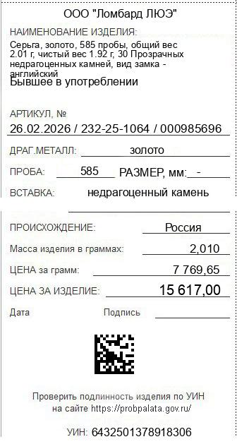 Цена за грамм общего веса: 7769.65Цена за грамм чистого веса: 8133.85Организация: ООО "Ломбард ЛЮЭ"Металл: золотоПроба: 585Артикул: 26.02.2026 / 232-25-1064 / 000985696Базовая единица: шт