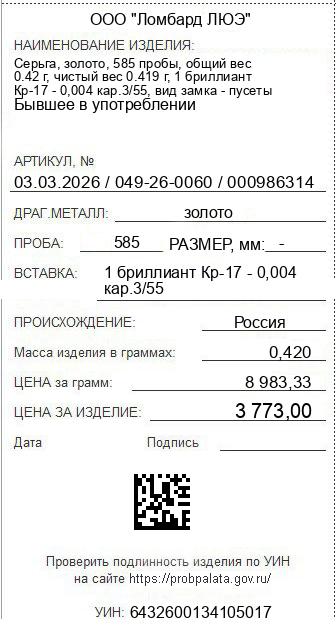 Цена за грамм общего веса: 8983.33Цена за грамм чистого веса: 9004.77Организация: ООО "Ломбард ЛЮЭ"Металл: золотоПроба: 585Артикул: 03.03.2026 / 049-26-0060 / 000986314Базовая единица: шт