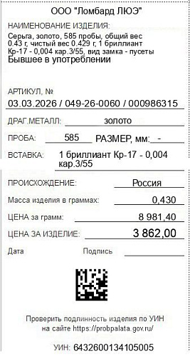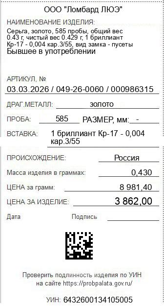 Цена за грамм общего веса: 8981.4Цена за грамм чистого веса: 9002.33Организация: ООО "Ломбард ЛЮЭ"Металл: золотоПроба: 585Артикул: 03.03.2026 / 049-26-0060 / 000986315Базовая единица: шт