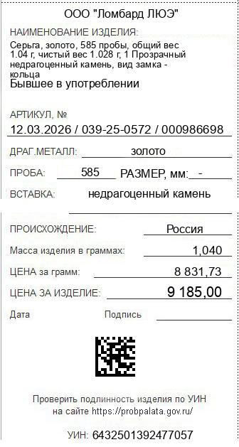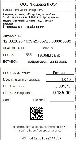 Цена за грамм общего веса: 8831.73Цена за грамм чистого веса: 8934.82Организация: ООО "Ломбард ЛЮЭ"Металл: золотоПроба: 585Артикул: 12.03.2026 / 039-25-0572 / 000986698Базовая единица: шт