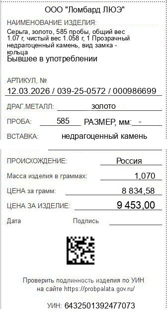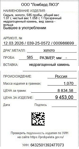 Цена за грамм общего веса: 8834.58Цена за грамм чистого веса: 8934.78Организация: ООО "Ломбард ЛЮЭ"Металл: золотоПроба: 585Артикул: 12.03.2026 / 039-25-0572 / 000986699Базовая единица: шт