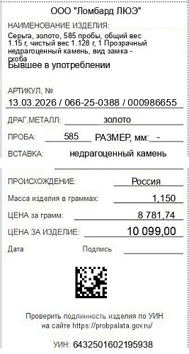 Цена за грамм общего веса: 8781.74Цена за грамм чистого веса: 8953.01Организация: ООО "Ломбард ЛЮЭ"Металл: золотоПроба: 585Артикул: 13.03.2026 / 066-25-0388 / 000986655Базовая единица: шт