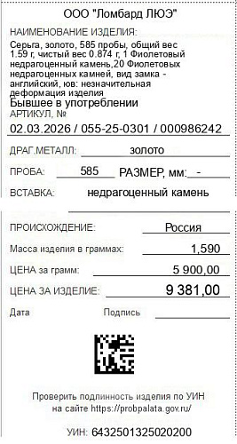 Цена за грамм общего веса: 5900Цена за грамм чистого веса: 10733.41Организация: ООО "Ломбард ЛЮЭ"Металл: золотоПроба: 585Артикул: 02.03.2026 / 055-25-0301 / 000986242Базовая единица: шт
